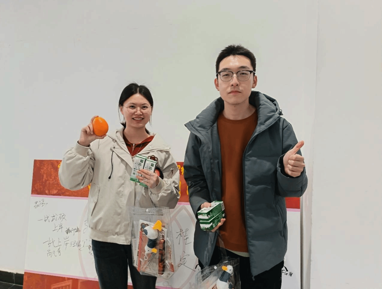 与会老师们为每位学子发放了精心准备的“考研加油包”。这份满载心意的礼物,用细节诉说祝福:一份温热的纯牛奶,为疲惫的日常注入能量;一枚饱满的红苹果,寓意沉着“应”考,平安顺遂;一颗沉甸甸的金橙,承载着心想事“橙”、马到“橙”功的美好期盼。