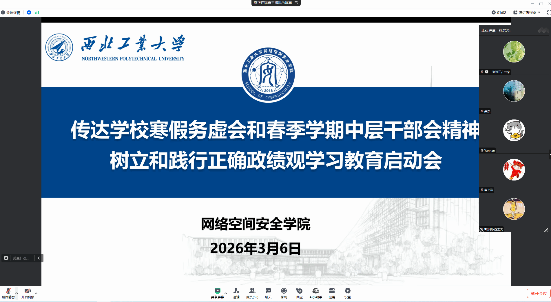 以线上形式召开全院教职工大会,传达学习学校2026年寒假务虚会、春季新学期中层干部会精神,统筹安排学院2026年春季学期重点工作,同时启动树立和践行正确政绩观学习教育工作。学院党政领导班子及全体教职工参加了会议,会议由学院党委书记张文涛主持。