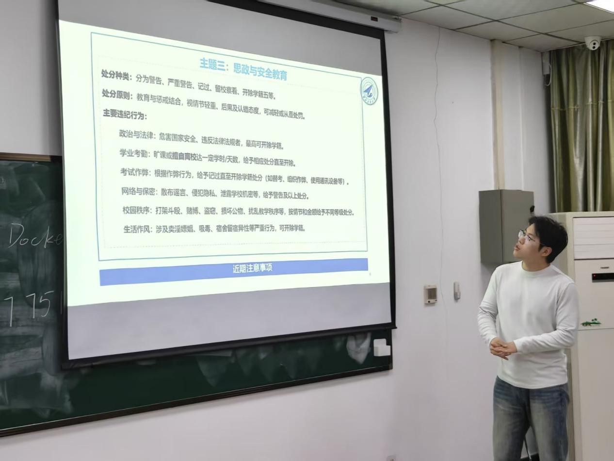 学生违纪处分管理办法》,强调了遵守校规校纪的重要性,督促大家自觉维护良好的学习和生活秩序。同时,他结合当前毕业季同学们面临的压力,提醒大家理性看待升学和就业带来的焦虑情绪,遇到困惑及时与辅导员、班团骨干沟通,保持身心愉悦。