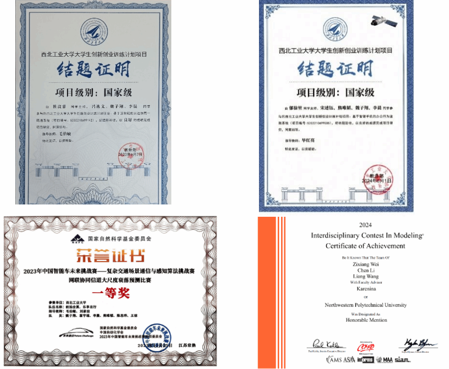 除了在科研与论文方面取得突出成果外,魏子翔同学在本科阶段还积极参加各类学科竞赛,展现出较强的综合实践能力与团队协作精神。2022年-2024年间,参加了两项国家级大学生创新创业项目,均获得良好结题。2023年,作为团队队长参与中国智能车未来挑战赛并获得全国一等奖;